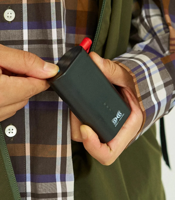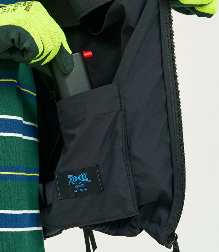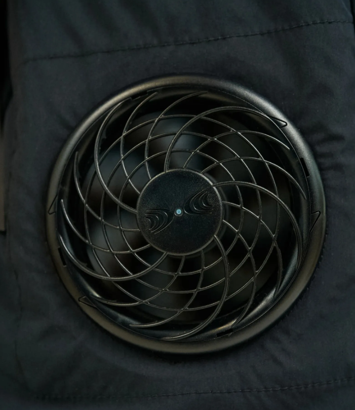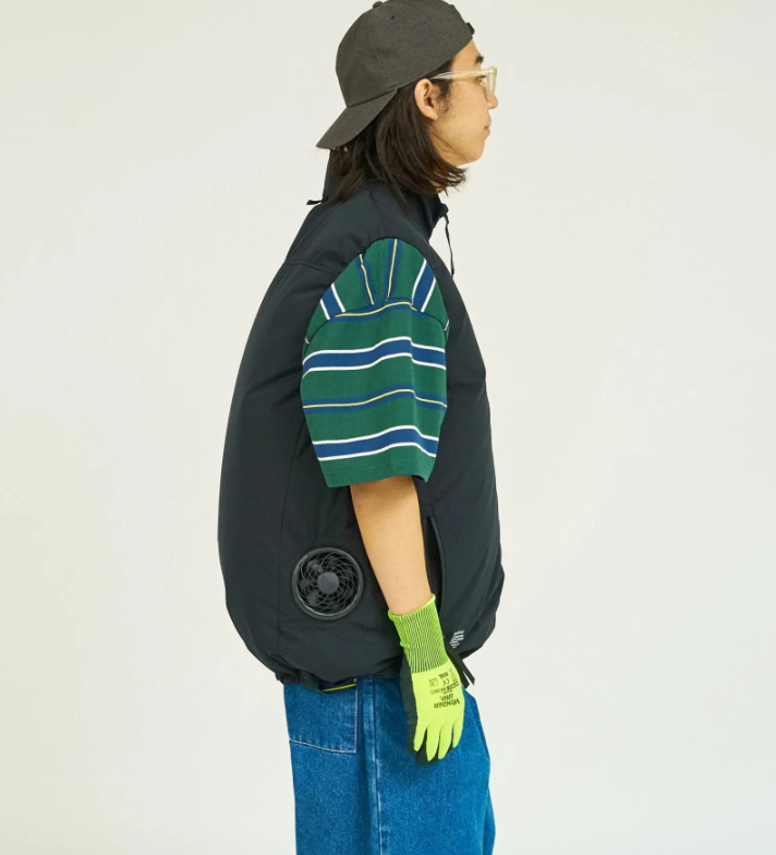 「AIR COOLING VEST FABRIC BY SOLOTEX®」冷却背心以柔软亲肤、抗皱不易变形的 SOLOTEX® 面料制成,除了配置多个实用口袋之外,两侧嵌入的散热风扇则是最大亮点,只要打开内部口袋中的电池开关,背心内的风扇就会开始运作,吸取外界空气进入衣服内部,建立循环气流层,从而让汗水快速蒸发,达到凉爽目的。内建风扇更拥有可以五段变化的送风强度,因此可以根据温度和穿着场合调整适当的风量。散热风扇声音细微,不会造成任何干扰。不仅功能性适合户外环境,外型设计也符合都市现代风格,吸入外部空气膨胀时更有羽绒背心的视觉效果,目前提供「BLACK」、「KHAKI」两个颜色选择。