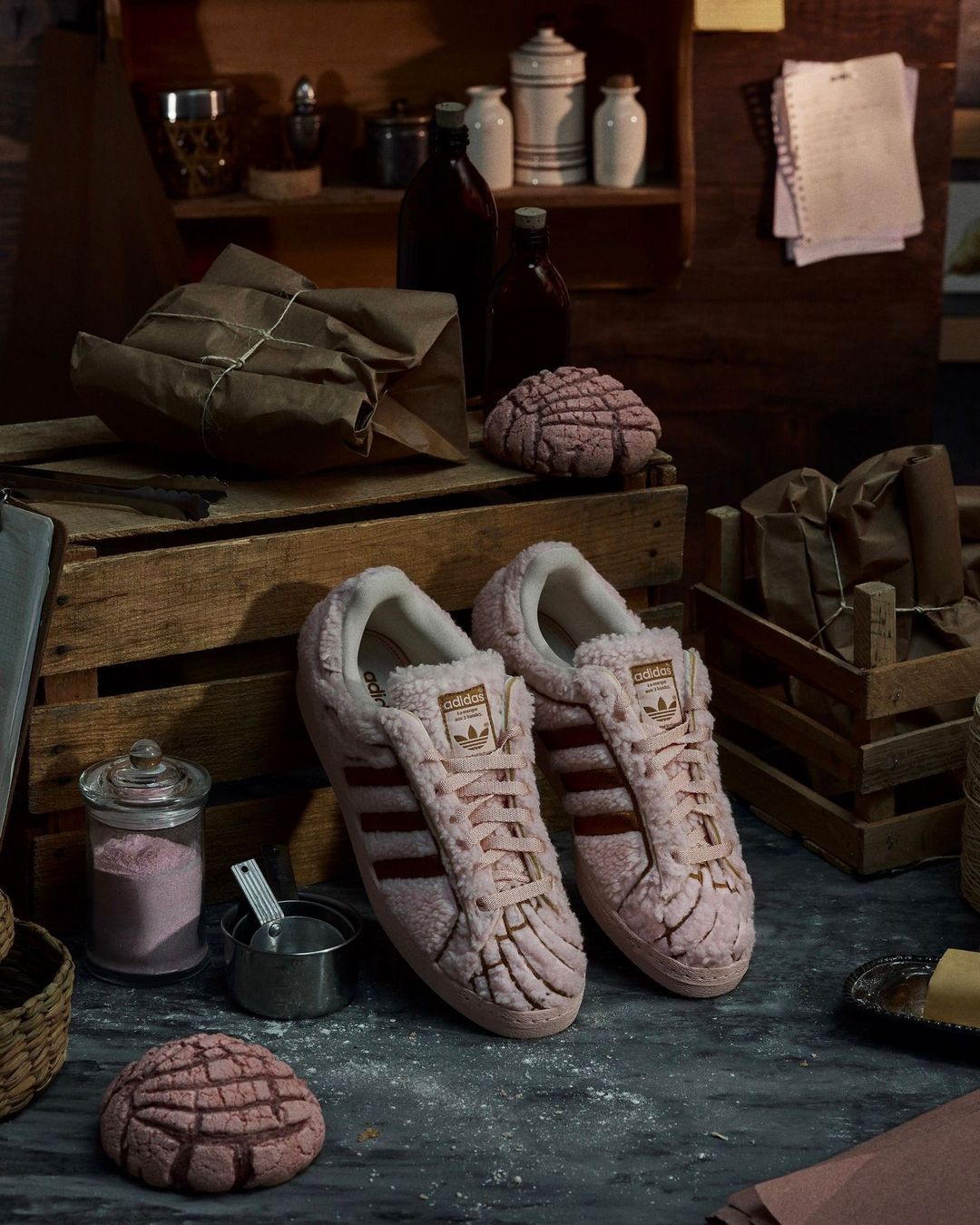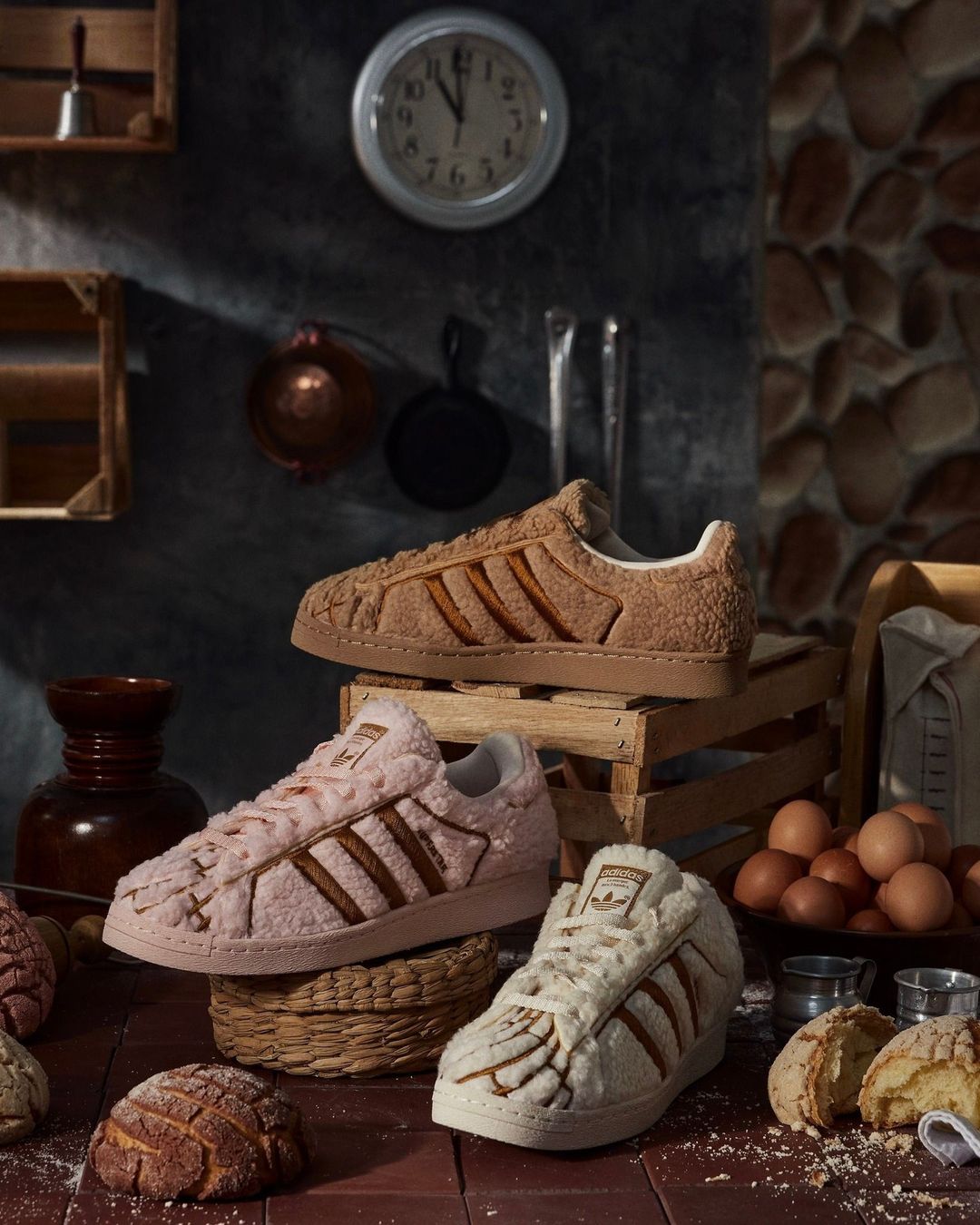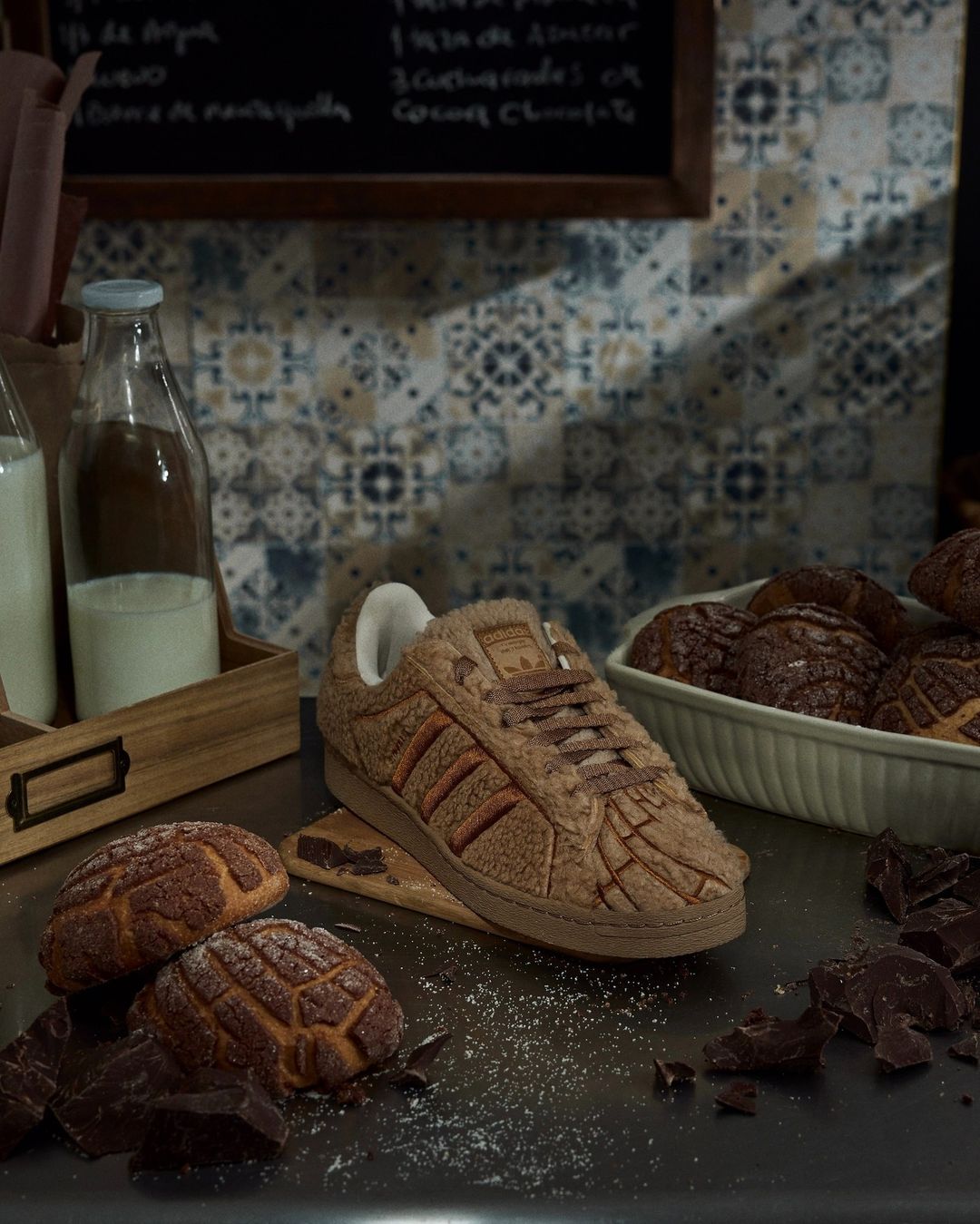 这款限定商品带来了一种独特的合作概念,将两种完全不同的文化元素融合在一起。墨西哥的Concha甜面包是当地的一项传统点心,而Superstar则是阿迪达斯品牌的经典运动鞋款。