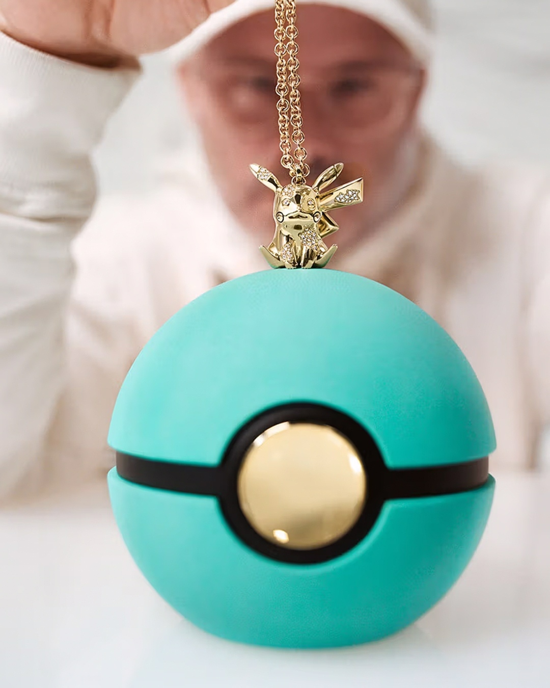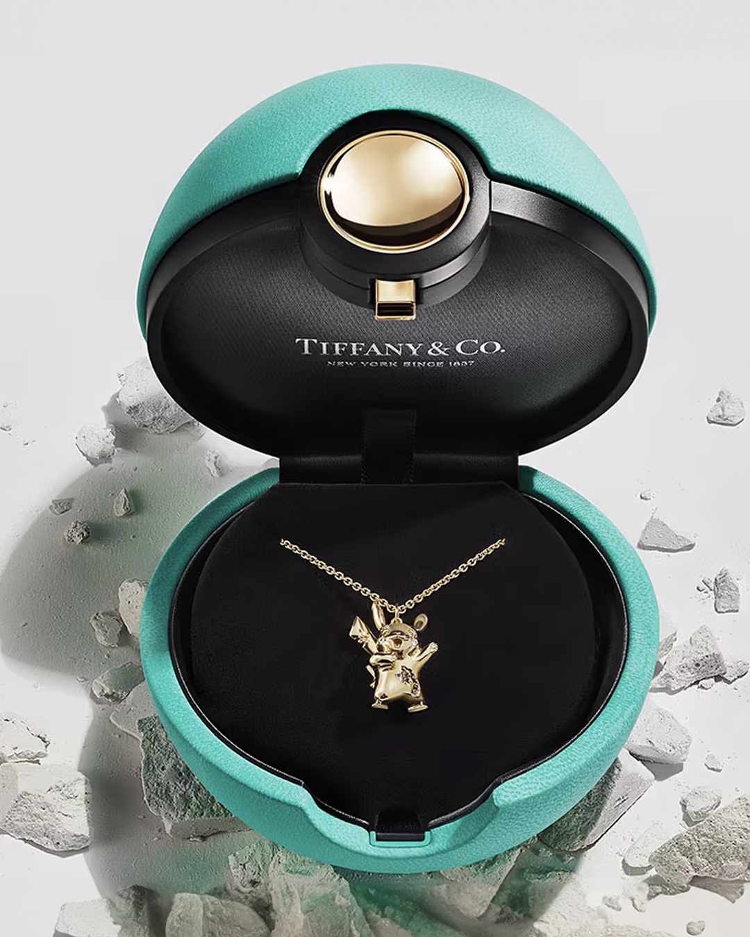 而品牌不只以精细工艺维妙维肖打造K金皮卡丘和纯银小火龙、胖丁和梦幻等宝可梦角色,精灵球造型的收纳盒也换上标志性的Tiffany Blue。