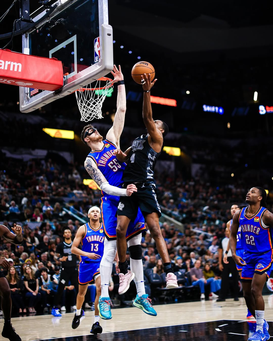 马刺福克斯和索汉内外结合,雷霆则靠亚历山大和卡鲁索回应,卡鲁索晃倒索汉三分命中,领先至105-100。