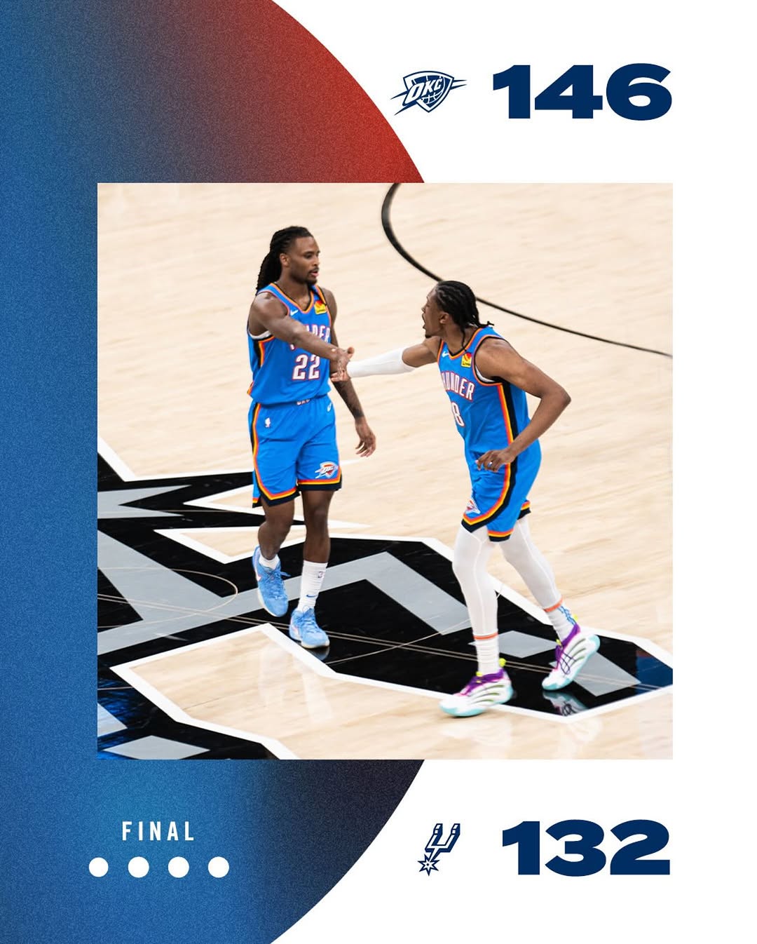 雷霆队:威廉姆斯41分6篮板7助攻、亚历山大31分4篮板8助攻、华莱士19分3篮板4助攻、威金斯17分3篮板2助攻、卡鲁索10分1篮板2助攻、哈尔滕施泰因10分11篮板6助攻、多尔特9分9篮板2助攻、吉昂7分2篮板1助攻、威廉姆斯2分3篮板1助攻、威廉姆斯3篮板1助攻。
