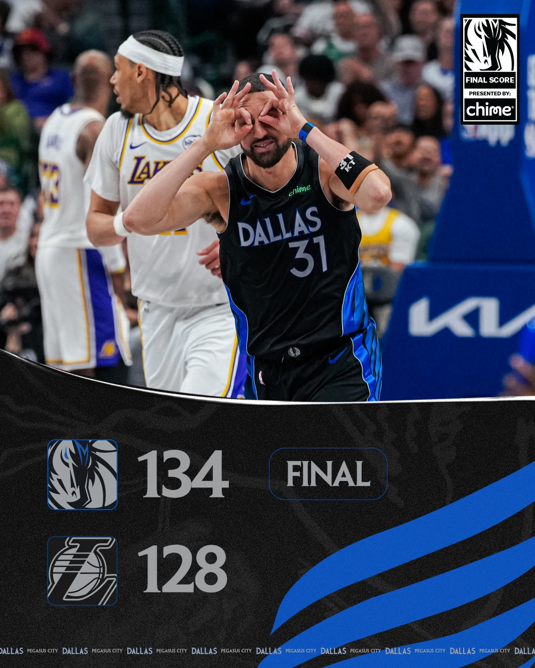 易篮再战,湖人持续追击,一度将差距缩小至仅2分,逼使独行侠叫出暂停。暂停过后,独行侠迅速回敬一波攻势,重新拉开比分。此后大部分时间,独行侠维持10分左右的领先优势,湖人虽试图逆转,始终无法越雷池一步。终场独行侠以6分之差收下胜利。